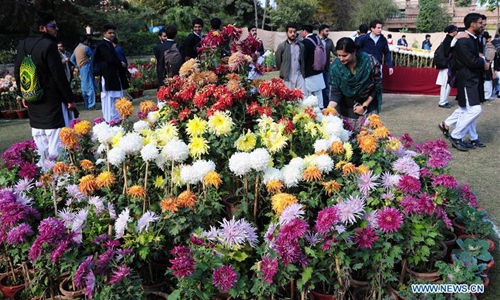 People visit a chrysanthemum flower show in northwest Pakistan's Peshawar on Dec. 11, 2019. (Photo by Saeed Ahmad/Xinhua)