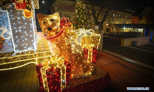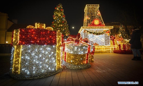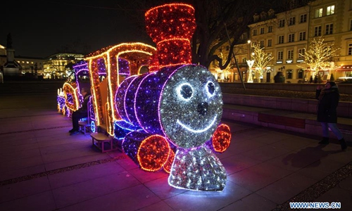 An illuminated installation is seen in the old town of Warsaw, Poland, on Dec. 11, 2019. The Old Town of Warsaw has been decorated with colorful lights to mark the Christmas season. (Photo by Jaap Arriens/Xinhua)