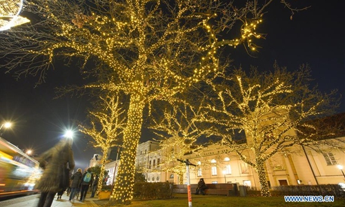 People walk past trees decorated with Christmas lights in the old town of Warsaw, Poland, on Dec. 11, 2019. The Old Town of Warsaw has been decorated with colorful lights to mark the Christmas season. (Photo by Jaap Arriens/Xinhua)