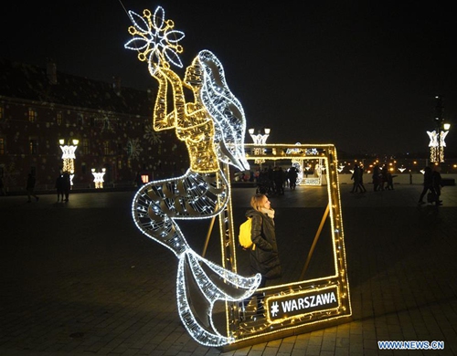 A woman poses for photos beside an illuminated frame in the old town of Warsaw, Poland, on Dec. 11, 2019. The Old Town of Warsaw has been decorated with colorful lights to mark the Christmas season. (Photo by Jaap Arriens/Xinhua)