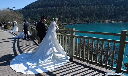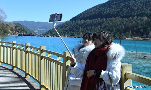 Tourists pose for photos at the Blue Moon Valley in Lijiang, southwest China's Yunnan Province, Dec. 10, 2019. (Xinhua/Yang Zongyou)