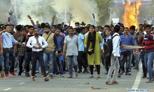 Protestors demonstrate against the Citizenship Amendment Bill (CAB) in Guwahati, India, Dec. 11, 2019. The upper house of Indian parliament, or Rajya Sabha, passed the controversial Citizenship Amendment Bill (CAB) Wednesday evening, officials said. (Str/Xinhua)