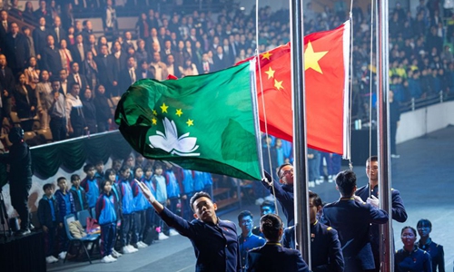 Students are raising China's national flag and the flag of the Macao Special Administrative Region (SAR) in an activity to celebrate the 20th anniversary of Macao's return to the motherland in Macao, south China, December 6, 2019. Photo: Xinhua