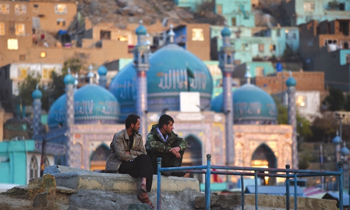 Men sit on a grave at the Kart-e-Sakhi cemetery in Kabul, Afghanistan on November 4. Photo: AFP