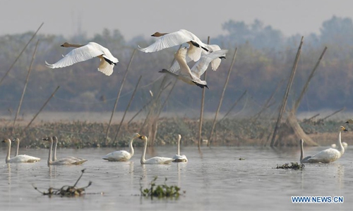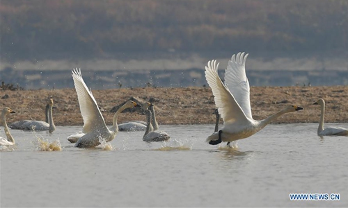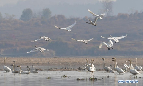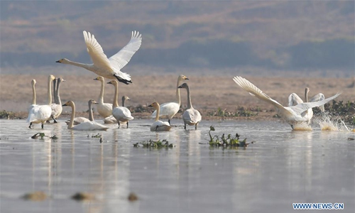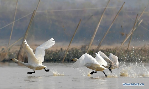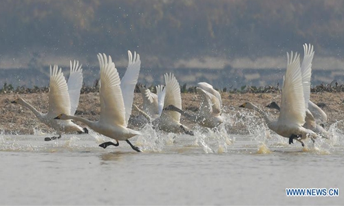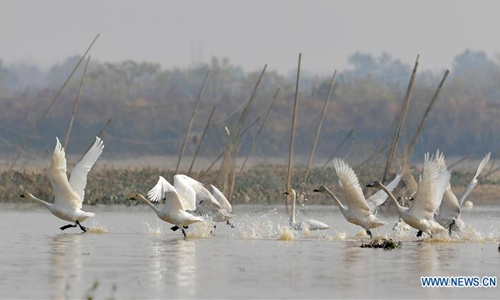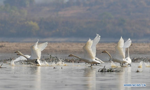 Swans take off in Fuhe River in Sanjiang Township, Nanchang County, east China's Jiangxi Province, Dec. 11, 2019. (Xinhua/Peng Zhaozhi)