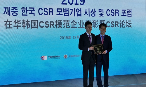 South Korean Ambassador to China Jang Ha-sung (right) presents award to a representative of Samsung at an annual CSR event in Beijing on Thursday. Photo: Yin Yeping/GT