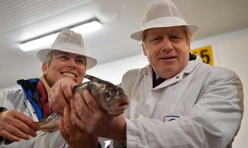 British Prime Minister and Conservative leader Boris Johnson poses holding a fish with Conservative candidate for Great Grimsby Lia Nici (left) during a general election campaign visit to Grimsby Fish Market, northeast England on Monday. Britain will go to the polls on December 12. Photo: AFP