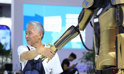 A visitor to the China International Software Product & Information Service Trade Fair holds hands with a bionic robot in Nanjing, East China's Jiangsu Province, on July 19. Photos: IC