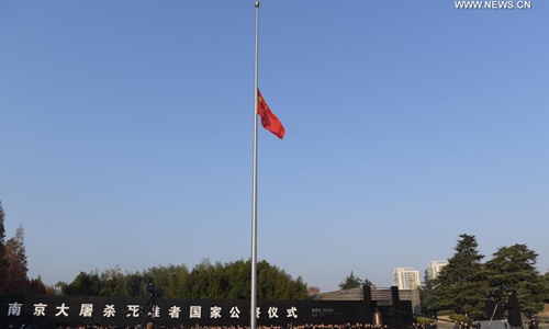 China's national flag flies at half-mast during a national memorial ceremony to commemorate the victims of the Nanjing Massacre at the memorial hall for the massacre victims in Nanjing, east China's Jiangsu Province, Dec. 13, 2019. Photo: Xinhua