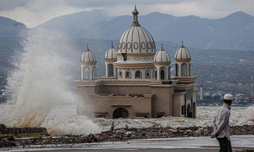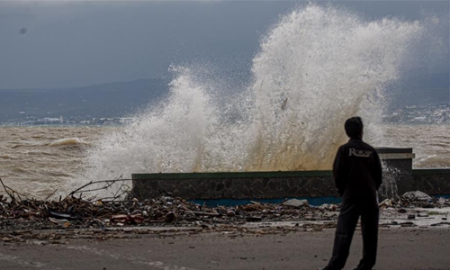 A man watches high wave at Palu Bay, Central Sulawesi, Indonesia, Dec. 12, 2019. The Meteorology, Climatology and Geophysics Agency (BMKG) has issued warnings of possible strong winds and high waves in several regions across Indonesia. Photo: Xinhua
