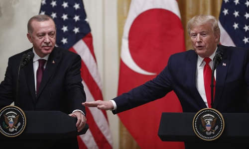 US President Donald Trump (R) and Turkish President Recep Tayyip Erdogan attend a joint press conference at the White House in Washington D.C. on Nov. 13, 2019. Donald Trump and Recep Tayyip Erdogan failed to reach agreement on major bilateral differences during their Wednesday's meeting at the White House. (Photo by Ting Shen/Xinhua)