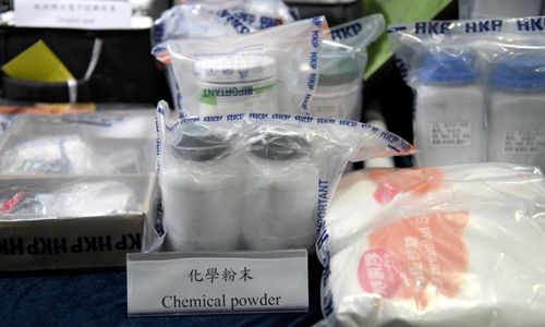 The Hong Kong police show at a press conference on Oct. 16, 2019 the materials used to make petrol bombs which were seized recently. Photo:Xinhua