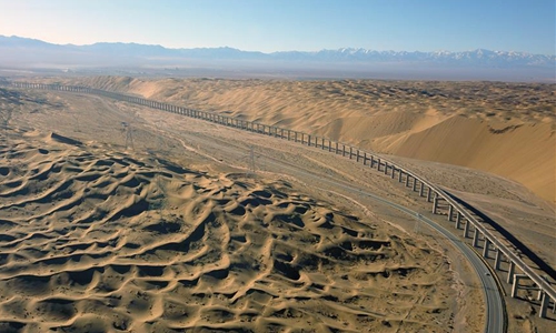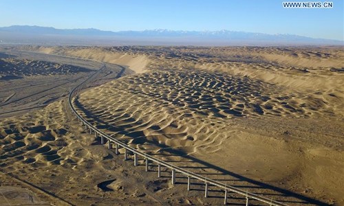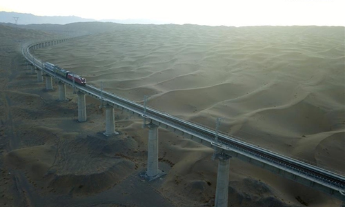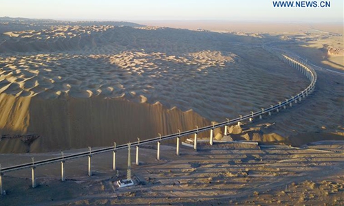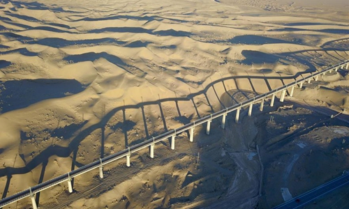 Aerial photo taken on Dec 11, 2019 shows the scenery of Shashangou grand bridge in Kazak Autonomous County of Aksay, northwest China's Gansu Province. The grand bridge is a difficulty in engineering on the railway linking Dunhuang city, northwest China's Gansu Province, and Golmud city, northwest China's Qinghai Province, which is scheduled to be put into operation in December. Photo:Xinhua