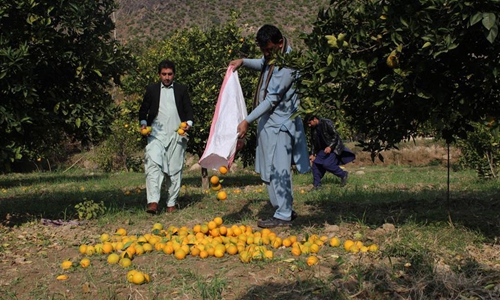Afghan men work at an orange garden in Shigal district of Kunar province, eastern Afghanistan, Dec. 14, 2019. (Photo by Emran Waak/Xinhua)