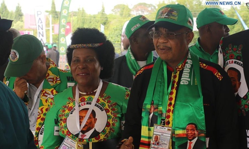 Zimbabwean President Emmerson Mnangagwa (L) and his wife Auxillia Mnangagwa (R) attend the National People's Conference of the ruling ZANU-PF party in Goromonzi, Zimbabwe, on Dec. 13, 2019. Zimbabwean President Emmerson Mnangagwa on Saturday called on Zimbabweans to be more productive to boost the economy at the end of the five-day conference. (Photo by Shaun Jusa/Xinhua)