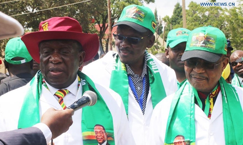 Zimbabwean President Emmerson Mnangagwa (L) and Zimbabwean Vice President Constantino Chiwenga (R) are seen during the National People's Conference of the ruling ZANU-PF party in Goromonzi, Zimbabwe, on Dec. 13, 2019. Zimbabwean President Emmerson Mnangagwa on Saturday called on Zimbabweans to be more productive to boost the economy at the end of the five-day conference. (Photo by Shaun Jusa/Xinhua)