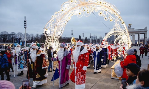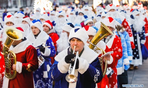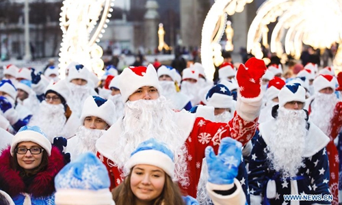 People dressed as Ded Moroz perform during the Ded Moroz festival in Moscow, Russia, on Dec. 14, 2019. The Ded Moroz (Grandfather Frost or Santa Claus in Russia) festival took place on Saturday in Moscow. (Photo by Maxim Chernavsky/Xinhua)