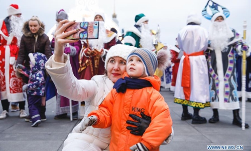 People take a selfie during the Ded Moroz festival in Moscow, Russia, on Dec. 14, 2019. The Ded Moroz (Grandfather Frost or Santa Claus in Russia) festival took place on Saturday in Moscow. (Photo by Maxim Chernavsky/Xinhua)