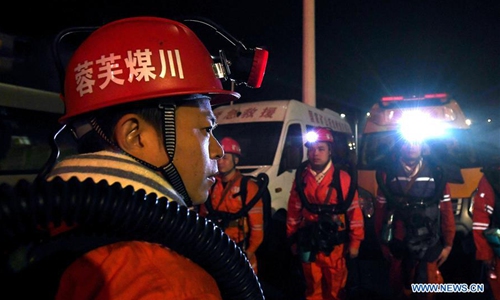 Rescuers prepare to enter the flooded coal mine in Gongxian County of Yibin City in southwest China's Sichuan Province, Dec. 15, 2019. Four miners were found dead and 14 others remained trapped underground in a flooded coal mine in southwest China's Sichuan Province, local authorities said Saturday. Rescuers are making all-out efforts to search for the trapped. Nearly 200 personnel have joined in the rescue and professional rescue forces have entered the well, according to the provincial emergency management bureau. (Xinhua/Xue Yubin)