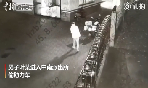 A man from Liuzhou, South China's Guangxi Zhuang Autonomous Region got caught for allegedly stealing a scooter at a local police station which he thought it was a good idea. Photo: Screenshot by video from Chinanews.com
