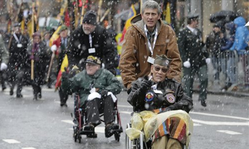 Veterans participate in a parade during the 70th anniversary of WWII's Battle of the Bulge, or the Ardennes Offensive, in Bastogne, Southeastern Belgium, on Saturday. The Battle of the Bulge, fought in the dense forests and narrow valleys of the Belgian and Luxembourg Ardennes, was one of the bloodiest battles of World War II. Photo: IC