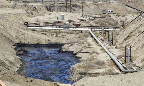 A crew works on seepage of more than 900,000 gallons of oil and brine water oil from an abandoned well at the Chevron Corps Cymric Oil Field that has transformed a dry creek bed into a black lagoon, on Thursday near McKittrick, California. Photo: VCG