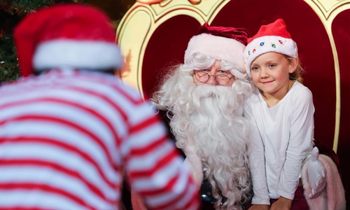 A gril poses for photos with a man dressed as Santa Claus during the Christmas fair at the Green Square in Sydney, Australia, Dec. 14, 2019. (Xinhua/Bai Xuefei)