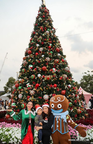 Visitors pose for photos during the Christmas fair at the Green Square in Sydney, Australia, Dec. 14, 2019. (Xinhua/Bai Xuefei)