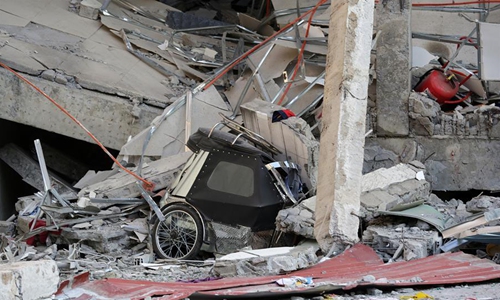 A tricycle is seen under a collapsed building in Pampanga Province, the Philippines, April 23, 2019. The death toll from the 6.1-magnitude earthquake that struck the Philippines' main Luzon Island rose to nine, local officials said on Tuesday. (Xinhua/Rouelle Umali)
