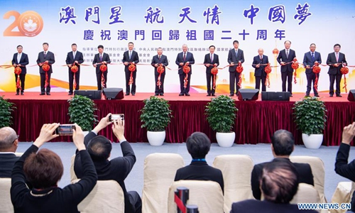 Honored guests attend the opening ceremony of an aerospace exhibition marking the 20th anniversary of Macao's return to the motherland at Macao University of Science and Technolocy in Macao, south China, Dec. 15, 2019. (Xinhua/Cheong Kam Ka)