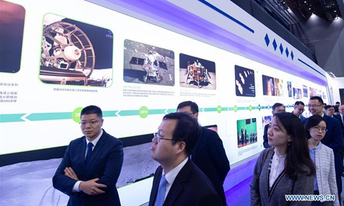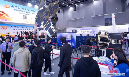 Visitors view exhibits at an aerospace exhibition marking the 20th anniversary of Macao's return to the motherland at Macao University of Science and Technolocy in Macao, south China, Dec. 15, 2019. The aerospace exhibition kicked off here on Sunday. Macao's first space exploration satellite was named Macao Science 1, the special administrative region (SAR)'s Secretary for Social Affairs and Culture Tam Chon Weng announced Sunday at the opening ceremony of the exhibition. (Xinhua/Cheong Kam Ka)