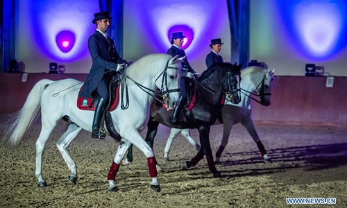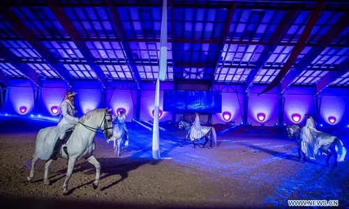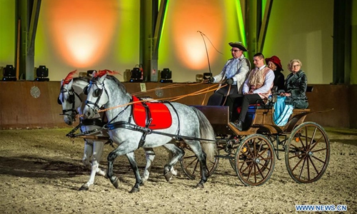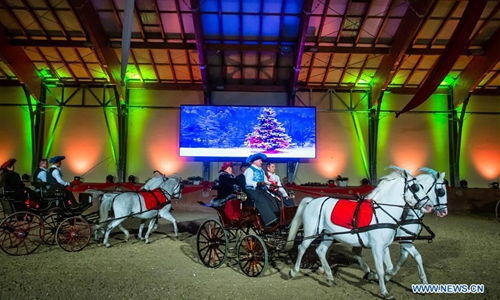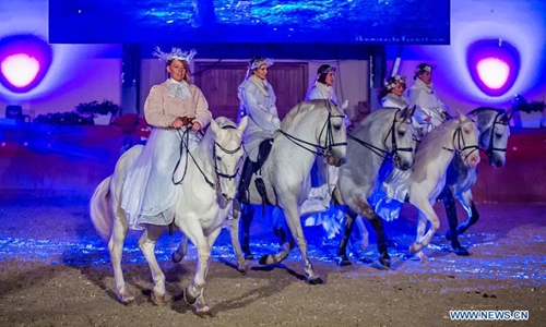 Lipizzaner horses perform during the Lipizzaner Christmas Ball at State Stud Farm in Dakovo, eastern Croatia, Dec. 14, 2019. The Lipizzaner Christmas Ball is a Baroque musical-stage show with Lipizzaner horses. (Davor Javorovic/Pixsell via Xinhua)