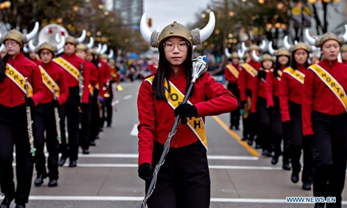 The 16th annual Santa Claus parade is held on Columbia Street in New Westminster, Dec. 15, 2019. The annual parade was held in the historic suburb of Vancouver to ring-in the festive Christmas season. (Photo by Andrew Soong/Xinhua)