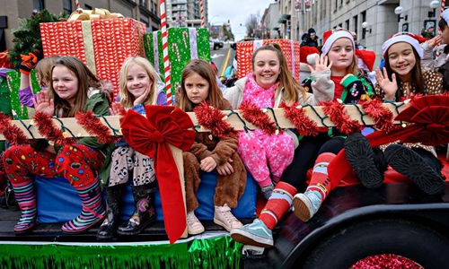 Kids enjoy the 16th annual Santa Claus parade on Columbia Street in New Westminster, Dec. 15, 2019. The annual parade was held in the historic suburb of Vancouver to ring-in the festive Christmas season. (Photo by Andrew Soong/Xinhua)