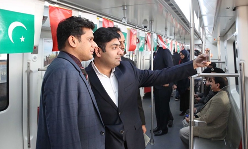 Three Pakistani men are posing for selfie on the wagon of the Orange Line Metro Train during a test run in Lahore, Pakistan, on Dec. 10, 2019. (Xinhua/Liu Tian)