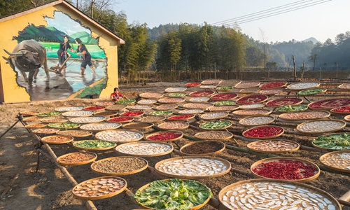 Villagers dry sweet potatoes, pumpkins, wild edible greens and red peppers in a courtyard in Aoshang village, East China's Jiangxi Province on Sunday. Photo: CNSphoto