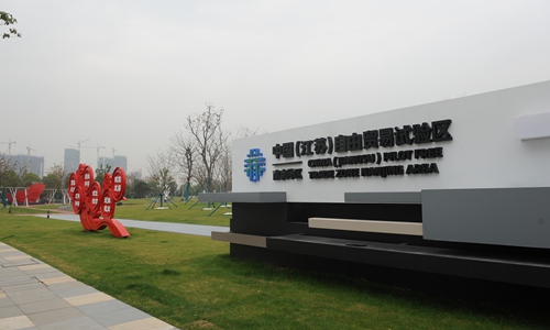 A sign of China (Jiangsu) Pilot Free Trade Zone Nanjing Area Photo: CNSPhoto