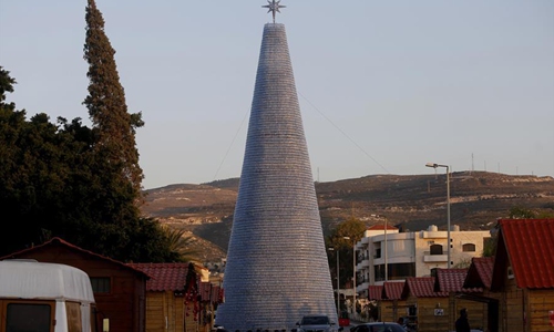Photo taken on Dec. 16, 2019 shows a giant Christmas tree made with plastic bottles in Chekka, northern Lebanon. The municipality of Chekka lit a Christmas tree made with plastic bottles on Monday. The tree, which is 28.5 meters tall and made with over 120,000 plastic bottles, was built in 20 days with support from villagers and scout troops. (Photo by Bilal Jawich/Xinhua)