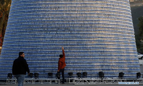 People look at a giant Christmas tree made with plastic bottles in Chekka, northern Lebanon, on Dec. 16, 2019. The municipality of Chekka lit a Christmas tree made with plastic bottles on Monday. The tree, which is 28.5 meters tall and made with over 120,000 plastic bottles, was built in 20 days with support from villagers and scout troops. (Photo by Bilal Jawich/Xinhua)