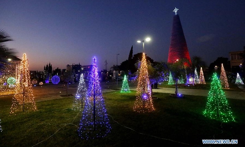 Photo taken on Dec. 16, 2019 shows an illuminated giant Christmas tree (Rear) made with plastic bottles in Chekka, northern Lebanon. The municipality of Chekka lit a Christmas tree made with plastic bottles on Monday. The tree, which is 28.5 meters tall and made with over 120,000 plastic bottles, was built in 20 days with support from villagers and scout troops. (Photo by Bilal Jawich/Xinhua)