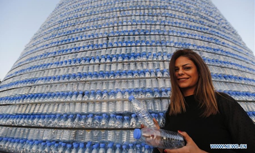 Caroline Chabtini, who created the project of building a giant Christmas tree with plastic bottles, poses in front of the work in Chekka, northern Lebanon, on Dec. 16, 2019. The municipality of Chekka lit a Christmas tree made with plastic bottles on Monday. The tree, which is 28.5 meters tall and made with over 120,000 plastic bottles, was built in 20 days with support from villagers and scout troops. (Photo by Bilal Jawich/Xinhua)