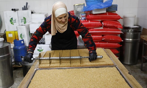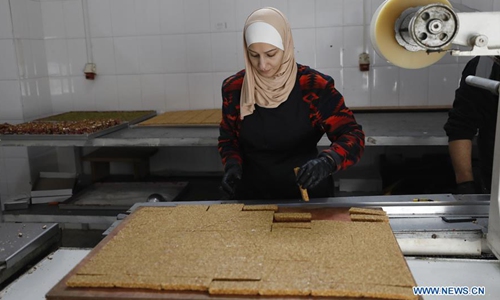 Palestinian Haya Sheikh Yassin works in making Turkish delight sweets inside her sweet shop called "quick", in the West Bank city of Nablus, Dec. 16, 2019. Haya Sheikh Yassin, 30, and her husband Ahmed Bisharat, 37, opened their own business 6 years ago, and it became their source of income. Turkish delight or Holkum is based on gel of starch and sugar. (Photo by Ayman Nobani/Xinhua)