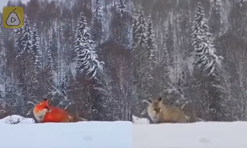 A rare red fox (left) seen in a viral video in the snow that's been viewed 110 million times, turns out to be a much more ordinary grey fox that had been tinted a bright red in the video just to get more likes. Screeenshot from Pear Video.