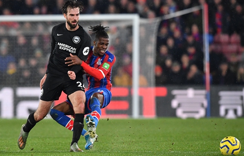 Crystal Palace's Wilfried Zaha (right) is fouled by Brighton's Davy Propper on Monday in London. Photo: AFP