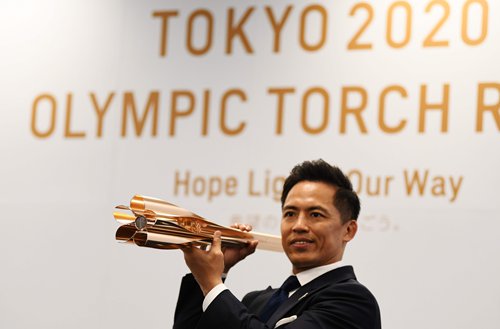 Torch relay ambassador Tadahiro Nomura presents the Tokyo 2020 Olympic Games torch for the torch relay in Tokyo. Photo: VCG