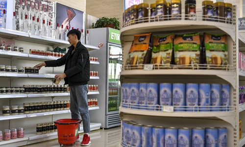 An employee arranges imported goods at Kashi free trade zone in Northwest China's Xinjiang Uyghur Autonomous Region on Tuesday. The products - including food, beverages and baby products - were imported from Central Asian countries including Kazakhstan, Kyrgyzstan and Georgia. Photo: cnsphoto