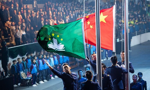 Students are raising China's national flag and the flag of the Macao Special Administrative Region (SAR) in an activity to celebrate the 20th anniversary of Macao's return to the motherland in Macao, south China, December 6, 2019. Photo: Xinhua