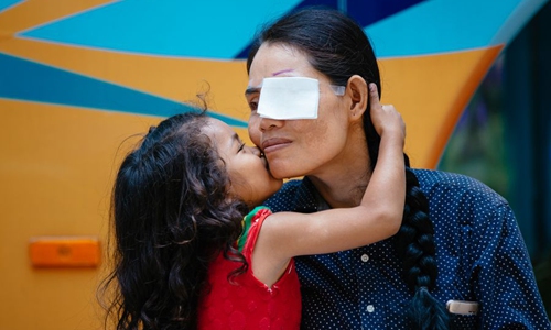 A patient receives a kiss from her daughter before a cataract surgery at Kampong Cham Provincial Hospital in Kampong Cham, Cambodia, March 15, 2019. (Xinhua/Zhu Wei)