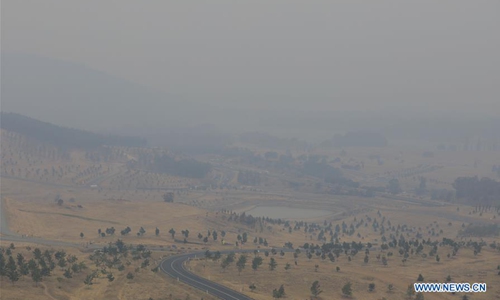 Photo taken on Dec. 17, 2019 shows the smoke-shrouded street in Canberra, Australia. Air pollution caused by bushfires continues in Canberra. (Photo by Chu Chen/Xinhua)