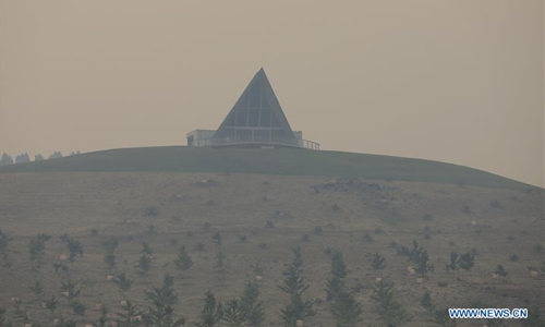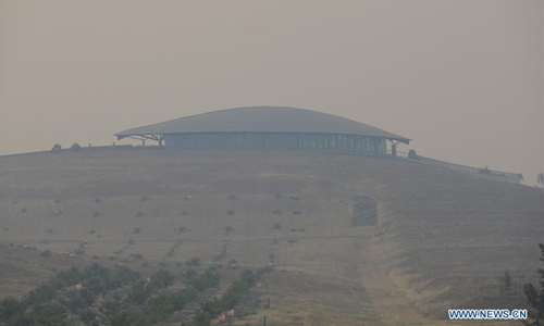 Photo taken on Dec. 17, 2019 shows the smoke-shrouded National Arboretum in Canberra, Australia. Air pollution caused by bushfires continues in Canberra. (Photo by Chu Chen/Xinhua)